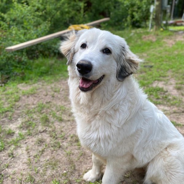 "*Woof! Woof!* My name is Annie Oakley and I am a Great Pyrenees. I like to roam the land to keep our guests safe and scare away unwanted visitors! I love meeting new people and sunbathing.”